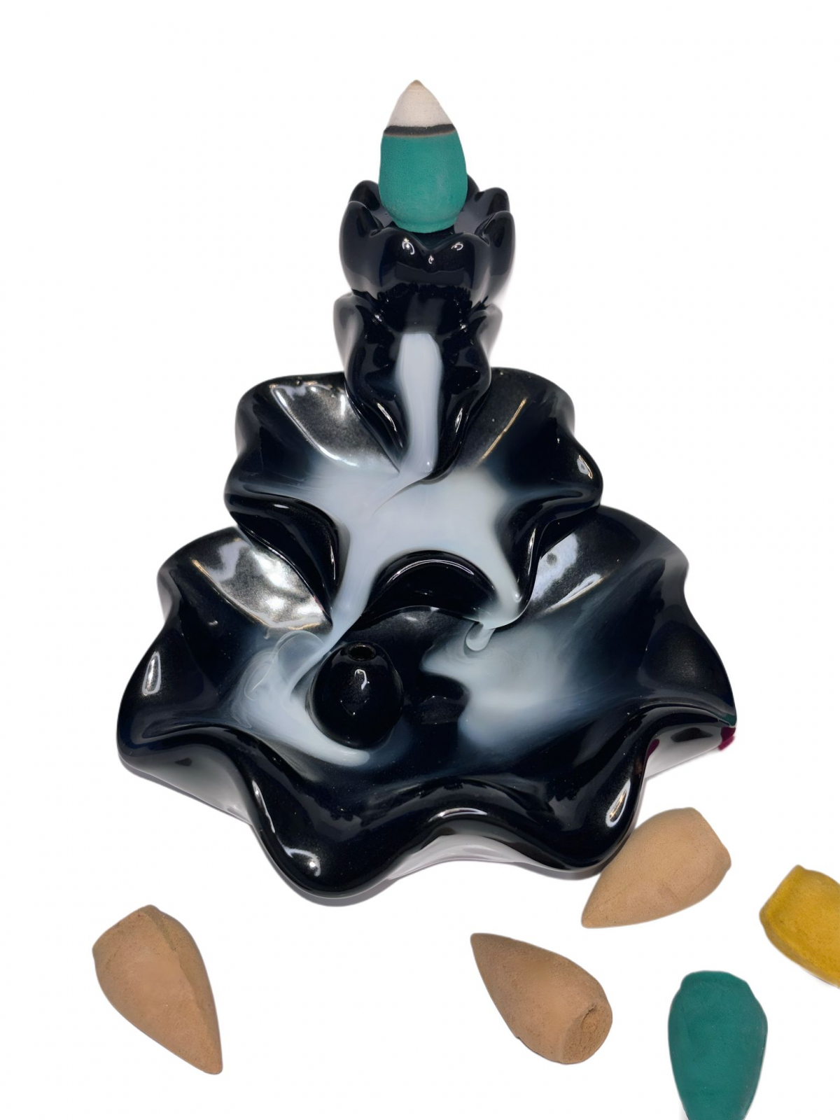 Arzătorul este însoțit de conuri de tămâie parfumate, care se potrivesc perfect în suportul său. Fiecare con emite un miros plăcut și liniștitor, contribuind la crearea unei atmosfere de pace și serenitate. Acesta este un cadou ideal pentru iubitorii de aromaterapie sau pentru cei care doresc să aducă o notă de rafinament și spiritualitate în viața lor. Fie că îl folosești în timpul meditației, învăluit de un parfum subtil, sau doar pentru a adăuga un strop de frumusețe camerei tale, acest arzător de tămâie va adăuga o notă specială oricărui spațiu."